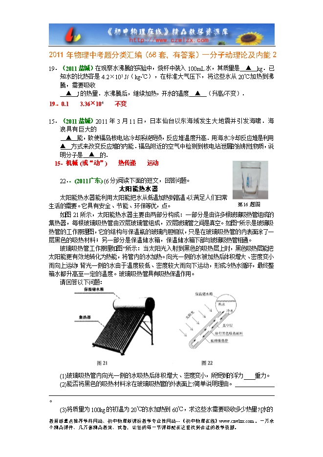 【内容简介】19.(2011盐城)在观察水沸腾的实验中,烧杯中装入100mL水,其质量是 ▲ kg.已知水的比热容是4.2×103 J/(kg?℃),在标准大气压下,将这些水从20℃加热到沸腾,需要吸收
