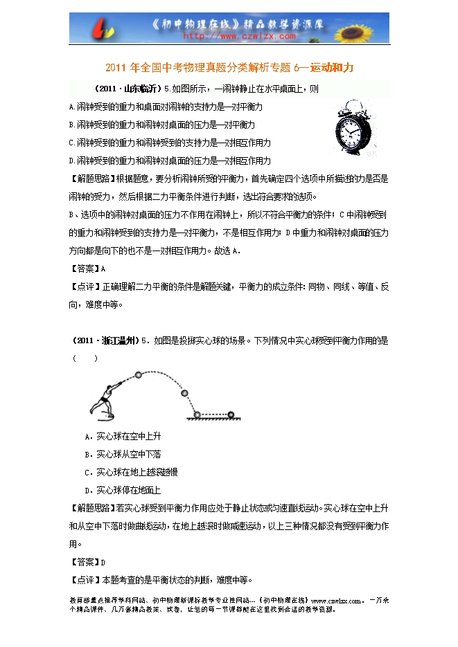 【内容简介】(2011?山东临沂)5.如图所示,一闹钟静止在水平桌面上,则