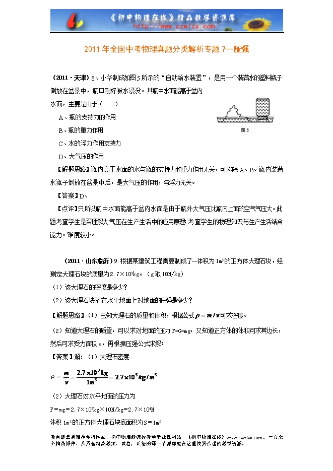 【点评】只所以瓶中水面能高于盆内水面是由于瓶外大气压比瓶内上面的空气气压大。此题考查学生是否理解大气压在生产生活中的应用原理;考查学生的物理知识与生产生活结合能力。难度较小。