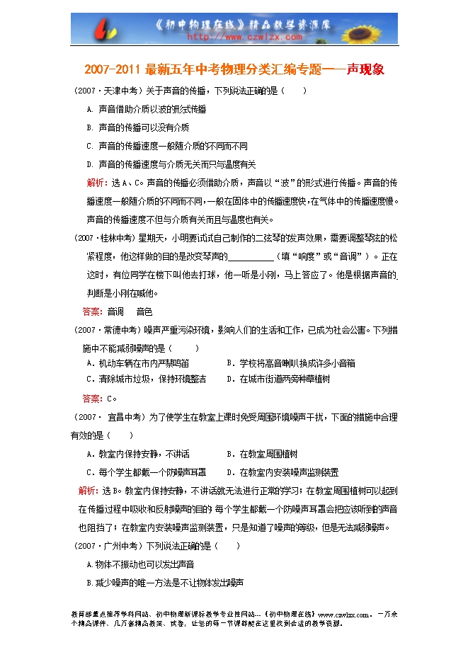 2007-2011最新五年中考物理分类汇编专题一--声现象