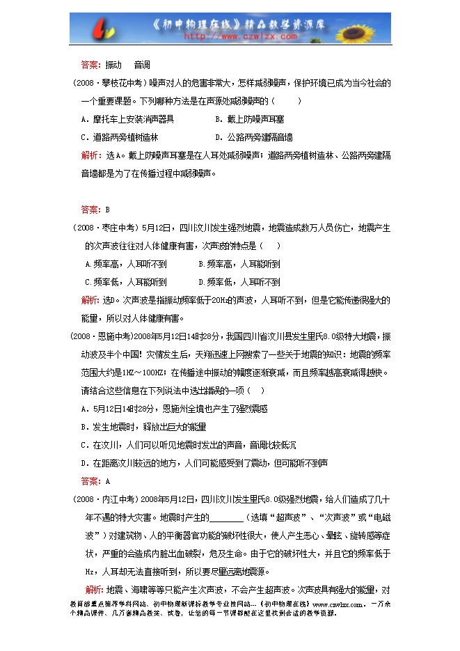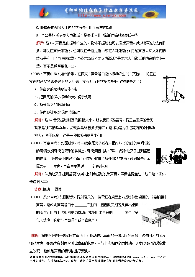 解析:选C。声音是由振动产生的,物体不振动也可以发出声音。减少噪声的方法有很多,可以在声源处减弱、也可以在传播过程中或在人耳处减弱。用超声波去除人体内的结石是利用了声波的能量。“公共场所不要大声说话”是要求人们说话的声音响度小一些,而不是频率要低一些。