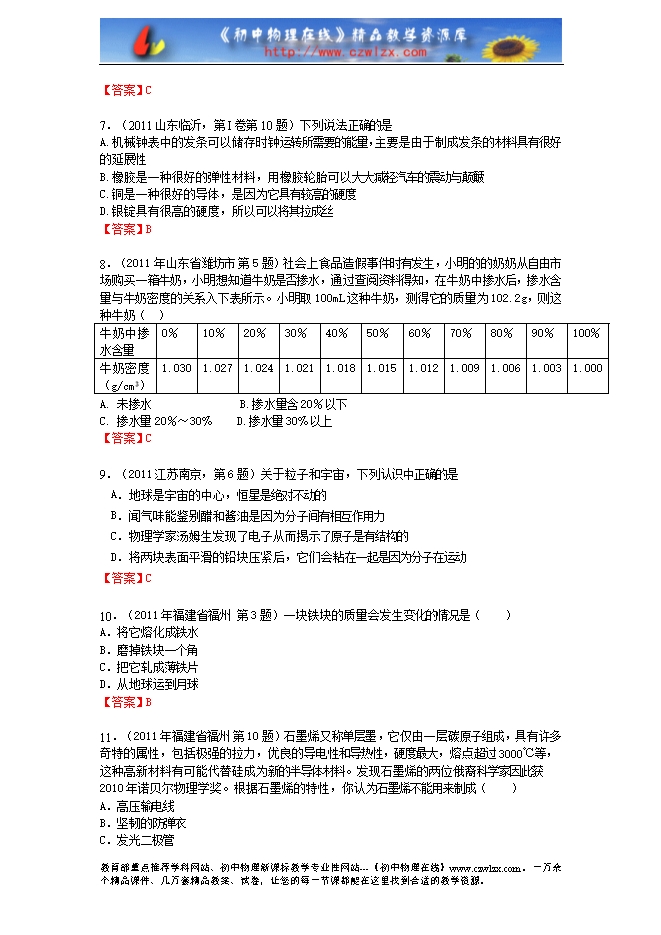 2007-2011最新五年中考物理分类汇编专题七--质量和密度