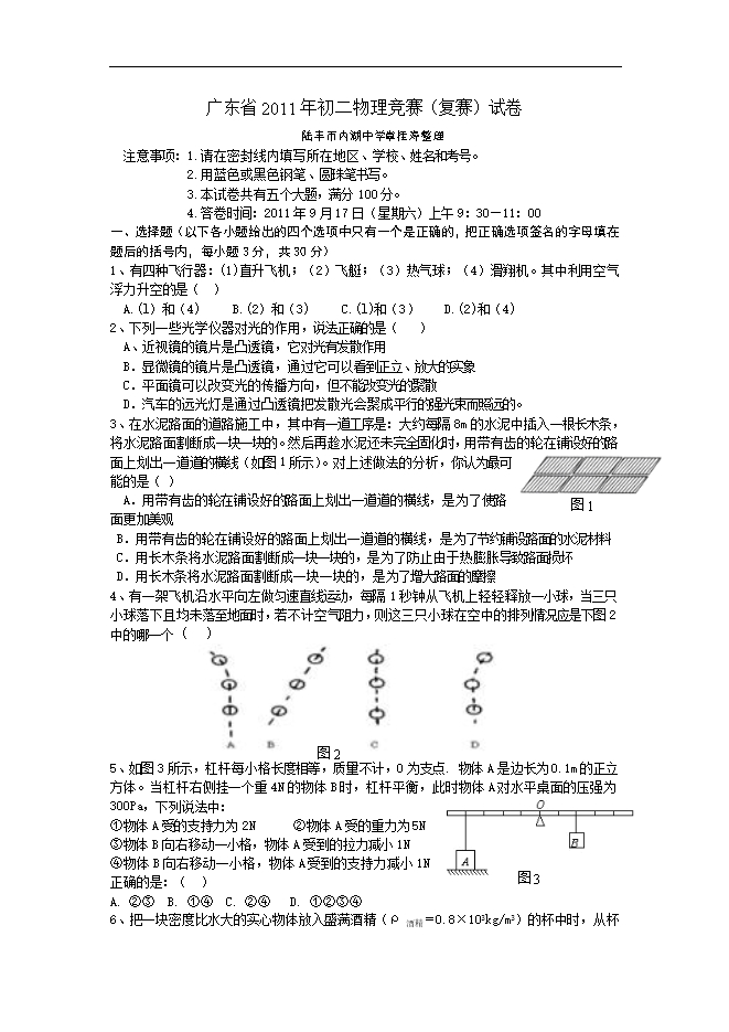 广东省2011年初二物理竞赛(复赛)试卷及答案(word版)