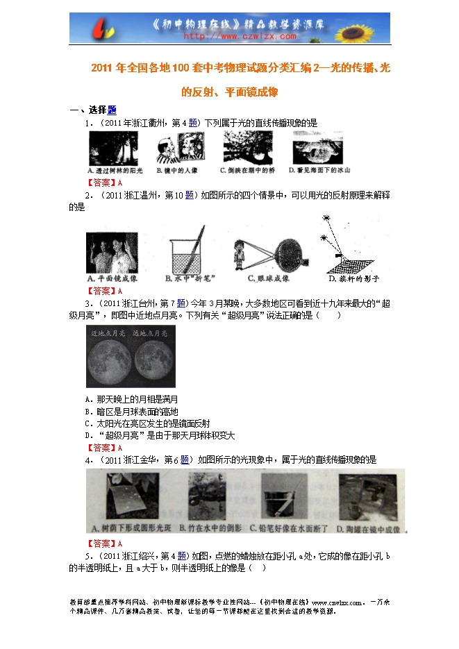 【内容简介】一、选择题 1.(2011年浙江衢州,第4题)下列属于光的直线传播现象的是 【答案】A 2.(2011浙江温州,第10题)如图所示的四个情景中,可以用光的反射原理来解释的是 【答案】A 3.(2011浙江台州,第7题)今年3月某晚,大多数地区可看到近十九年来最大的“超级月亮”,即图中近地点月亮。下列有关“超级月亮”说法正确的是(  ) A.那天晚上的月相是满月 B.暗区是月球表面的高地 C.太阳光在亮区发生的是镜面反射 D.“超级月亮”是由于那天月球体积变大 【答案】A 4.(2011浙江金华,第6题).如图所示的光现象中,属于光的直线传播现象的是 【答案】A 5.(2011浙江绍兴,第4题)如图,点燃的蜡烛放在距小孔a处,它成的像在距小孔b的半透明纸上,且a大于b,则半透明纸上的像是( ) A.倒立、放大的虚像 B.正立、缩小的虚像 C.倒立、缩小的实像 D.正立、放大的实像 ........ ? 下载word文档压缩附件(.rar) ?