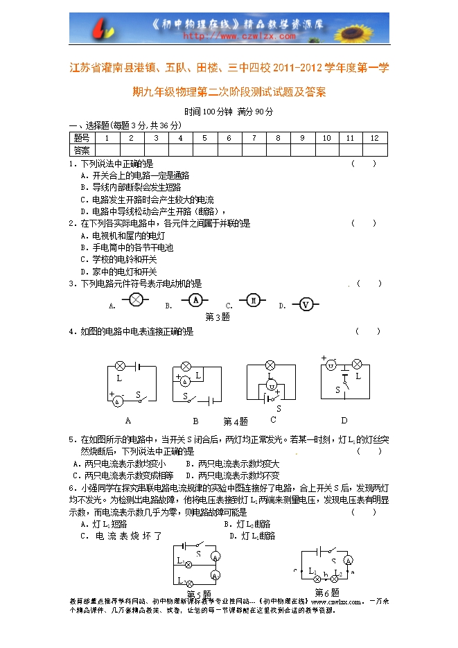 江苏省灌南县港镇、五队、田楼、三中四校2011-2012学年度第一学期九年级物理第二次阶段测试试题及答案