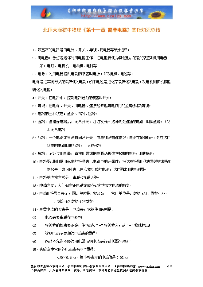 12、电流方向:人们规定正电荷定向移动的方向为电流的方向。