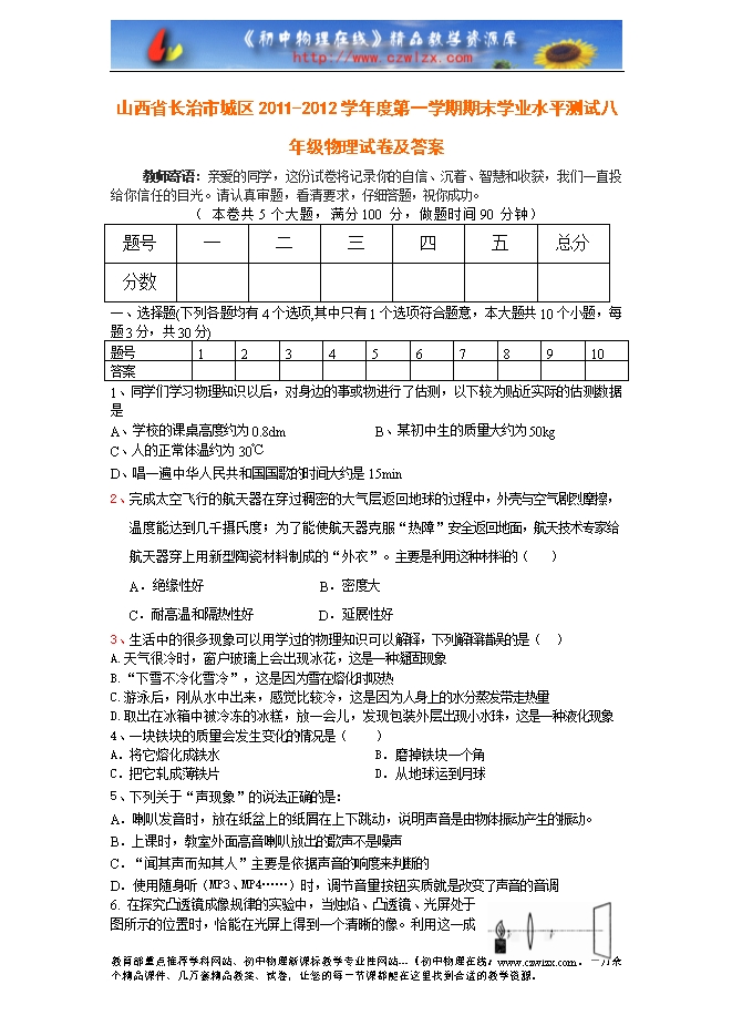 山西省长治市城区2011-2012学年度第一学期期末学业水平测试八年级物理试卷及答案