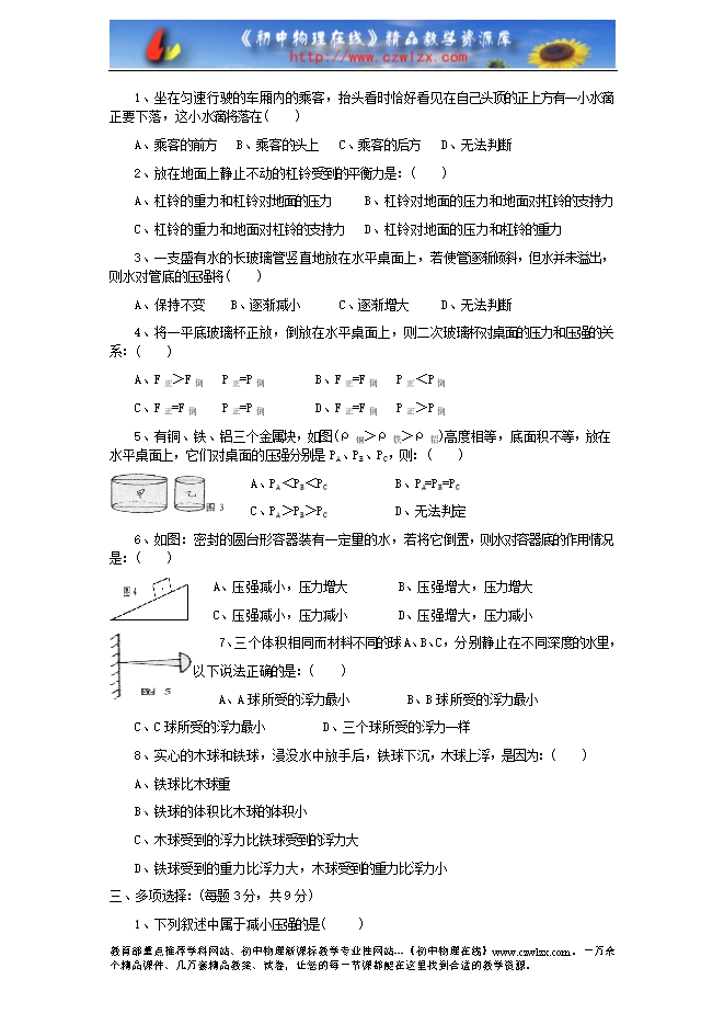 【内容简介】一、填空: (每空1分,共27分)   1、当汽车向右拐弯时,站在行驶车上的乘客要向(  )侧倾斜,这是因为车向右拐时人的脚底由于摩擦    但上身由于    仍保持原来的运动状态。   2、小车重200牛,在水平路面上做匀速直线运动,如果它受到水平向右的拉力是20牛,则它受到的摩擦力是    ,方向    。   3、如图:竖直的墙面所受压力大小为    ,物体与墙面间摩擦力为    。          4、物体    受到的压力叫压强,压力是    压在物体表面上的力。   5、 容器内装有密度为0.8×103千克/米3的酒精,则A、B、C各点所受液体压强分别为    、    、    。   6、拦河坝大坝高60米,坝内水深50米,水对坝底的压强为    。   7、一块砖长、宽、高之比为5:3:1,将砖平放、侧放、立放在水平地面上,砖对地面的压力之比为    ,砖对地面的压强之比    。   8、著名的    实验证明了大气压的存在,    实验首先测出了大气压的值。   9、1标准大气压能支持    高的水柱。   10、水深10米,轮船舱底在水面下3.5米,船底穿了一个面积为0.2米2的洞,要想堵住这个洞需要对档板施    牛的力。   11、浮力的方向总是    。 ......... ? ? ?