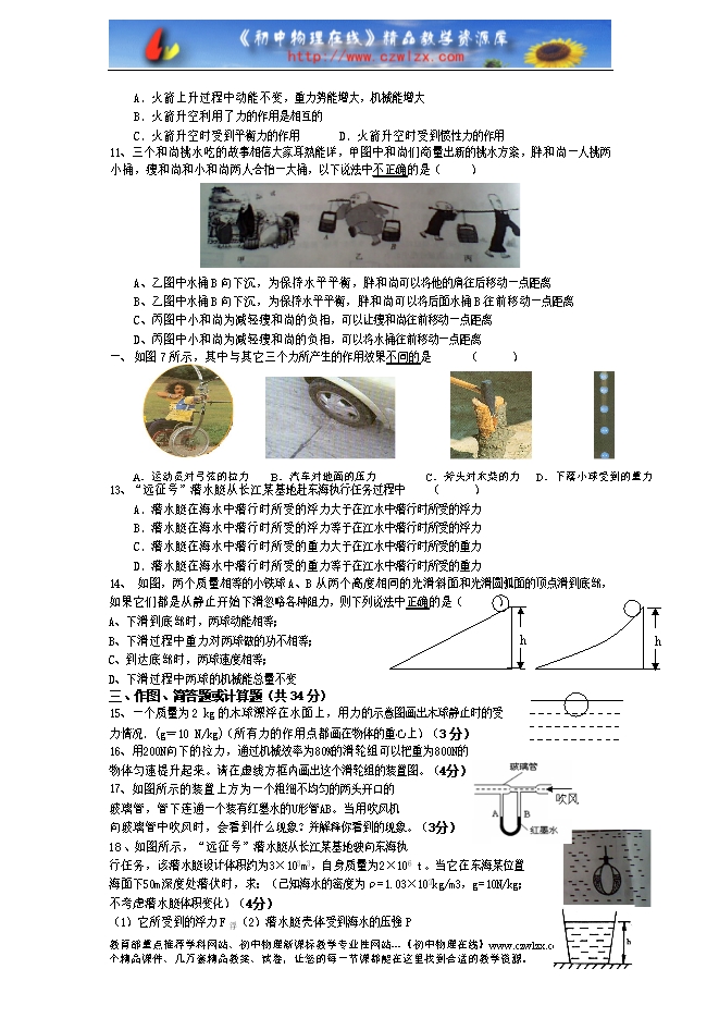 4、用50 N的水平拉力拉着重为200 N的小车沿水平道路在1 min内前进60 m,