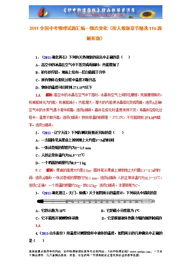 【内容简介】1.(2011?湖北黄石)下列有关热现象的说法中正确的是( )