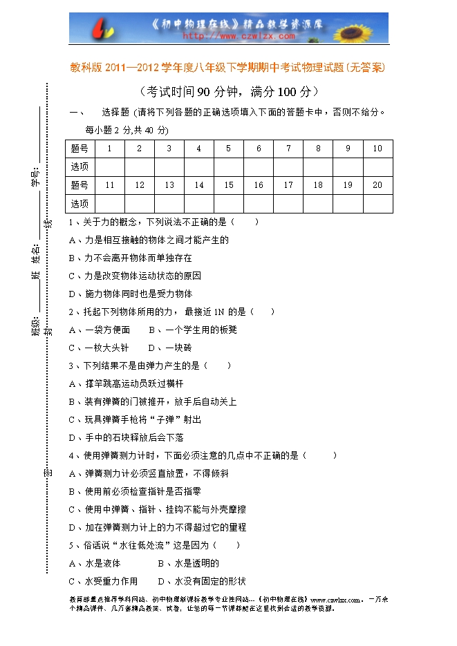 教科版2011—2012学年度八年级下学期期中考试物理试题
