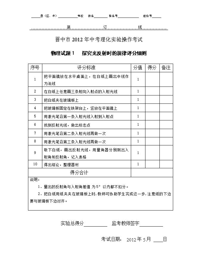 晋中市2012年中考理化实验操作考试试题(word版共24个实验)