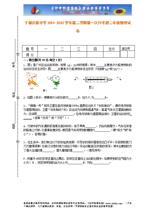 于都实验中学2011-2012学年第二学期第一次月考初二年级物理试卷