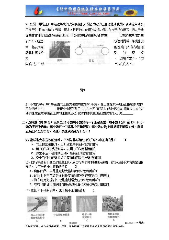 5、在生活中,我们有过以下的体验或观察:①写字的笔杆握笔处凹凸不平;②厨房的菜刀刀刃磨得很薄;③装订试卷时用力按压订书机;④运动鞋底花纹做的很深。其中主要目的为了增大压强的是 ,增大摩擦的是 。(填写序号)