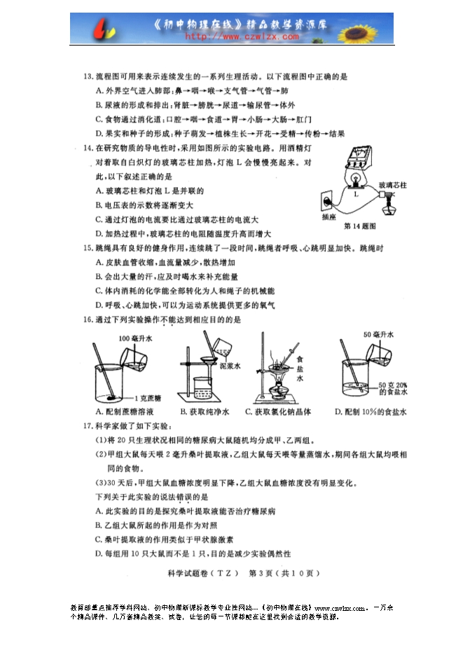 浙江省台州市2012年初中毕业生学业考试科学试题卷及答案(扫描版)