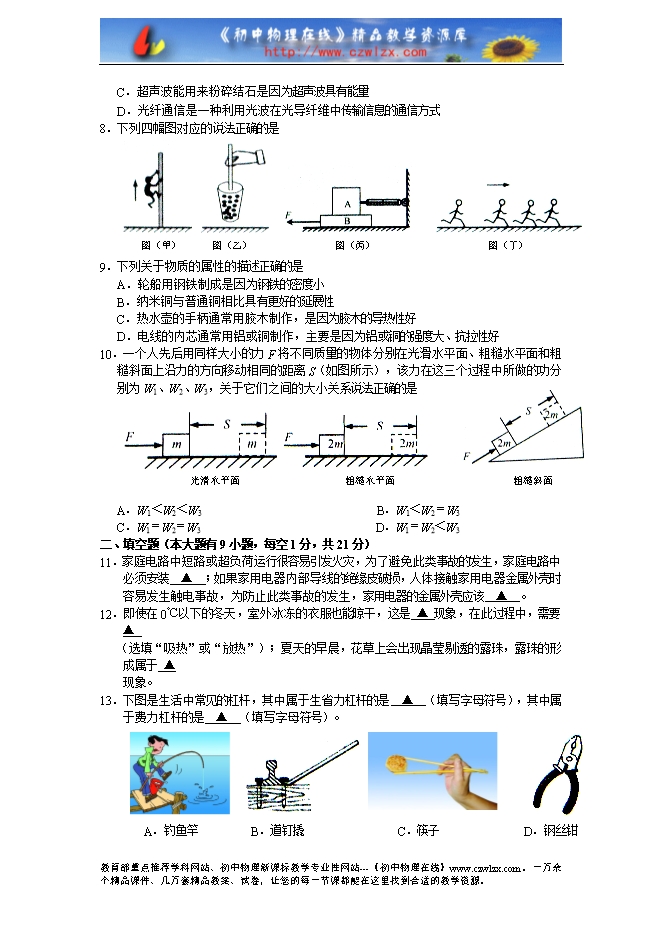 连云港市2012年高中段学校招生统一文化考试物理试题及答案(word版试题,答案扫描)