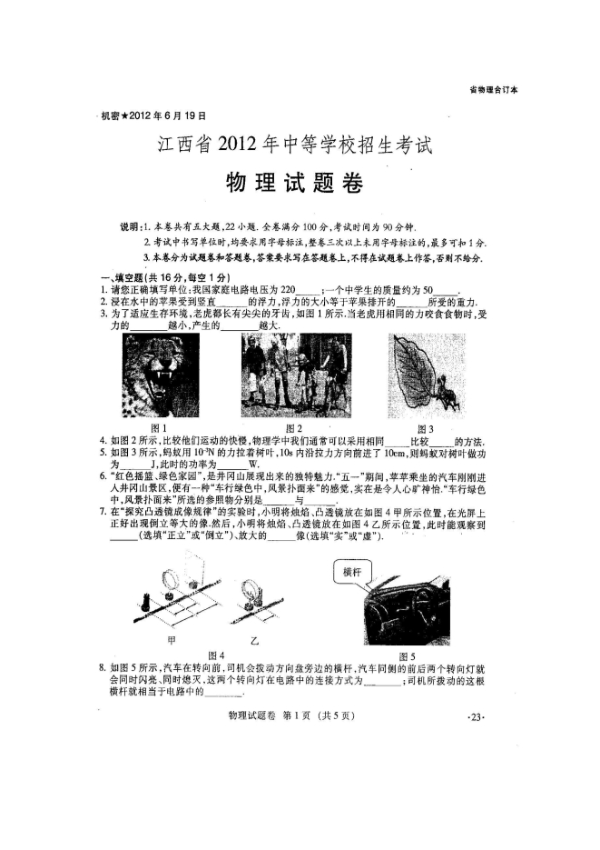 2012年江西省中等学校招生考试物理试题卷与答案(扫描版)