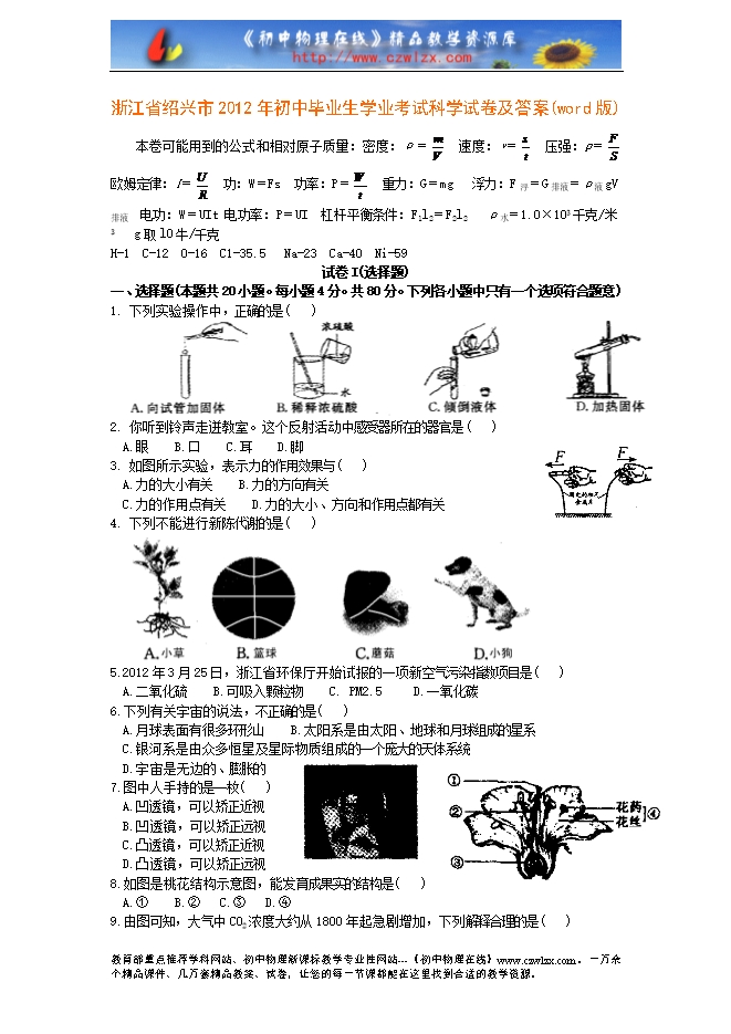 浙江省绍兴市2012年初中毕业生学业考试科学试卷及答案(word版)