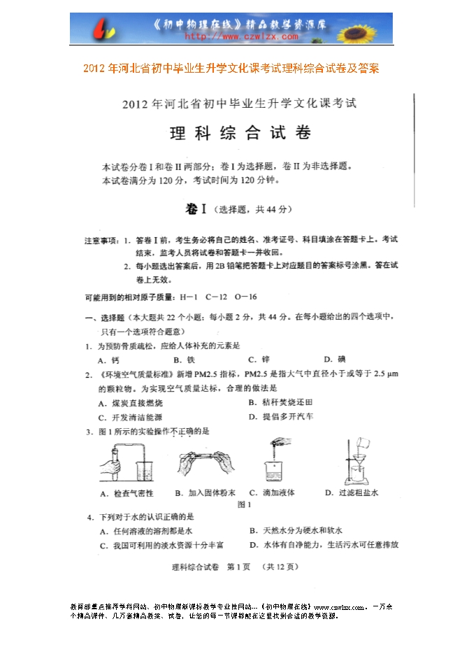 【内容简介】2012年河北省初中毕业生升学文化课考试理科综合试卷及答案(扫描版)