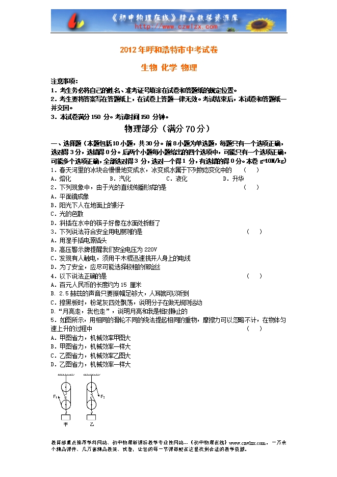 内蒙古呼和浩特市2012年中考物理试题及答案(word版,答案扫描)