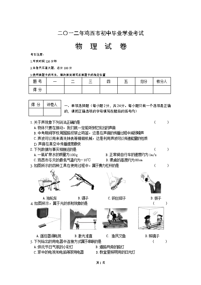 黑龙江省鸡西市2012年中考物理试题及答案(word版)