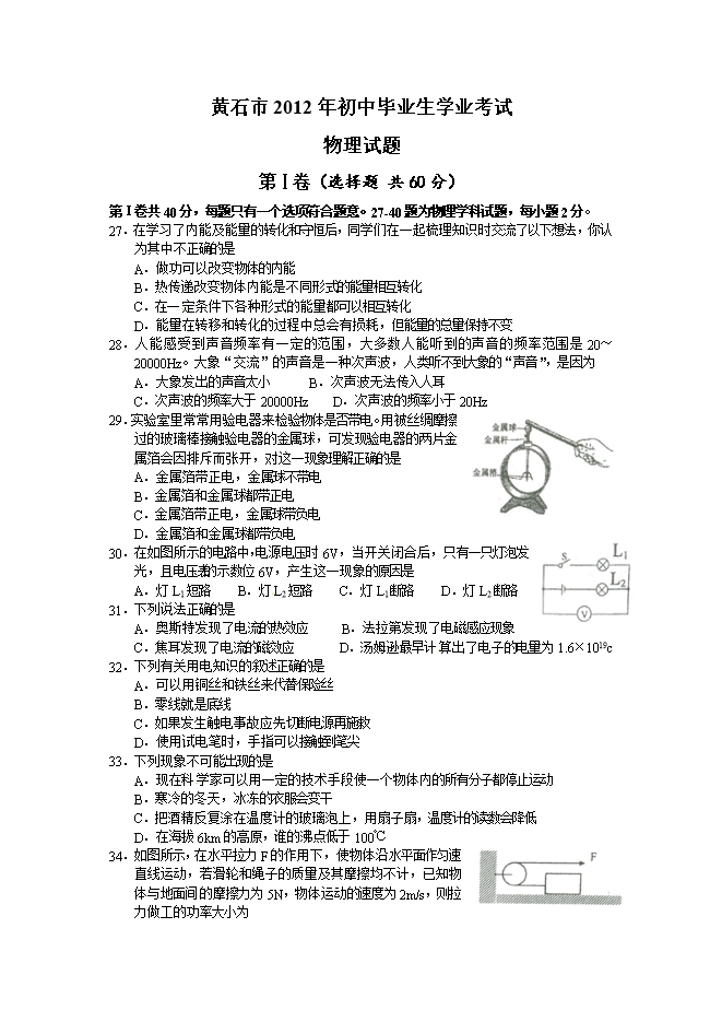 湖北省黄石市2012年初中毕业生学业考试物理试题及答案(word版)