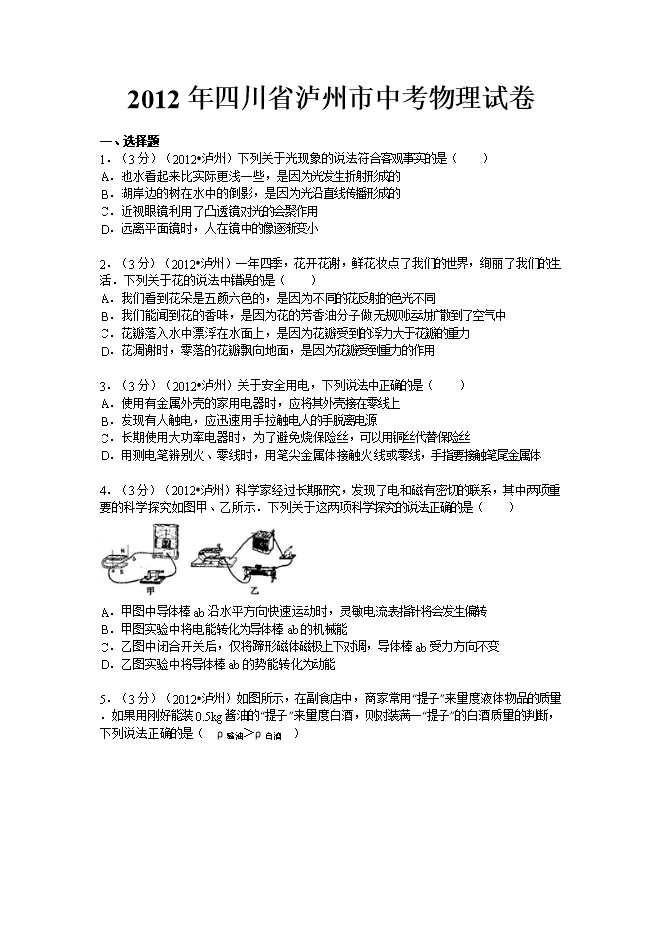 2012年四川省泸州市中考物理试卷及解析(word版)