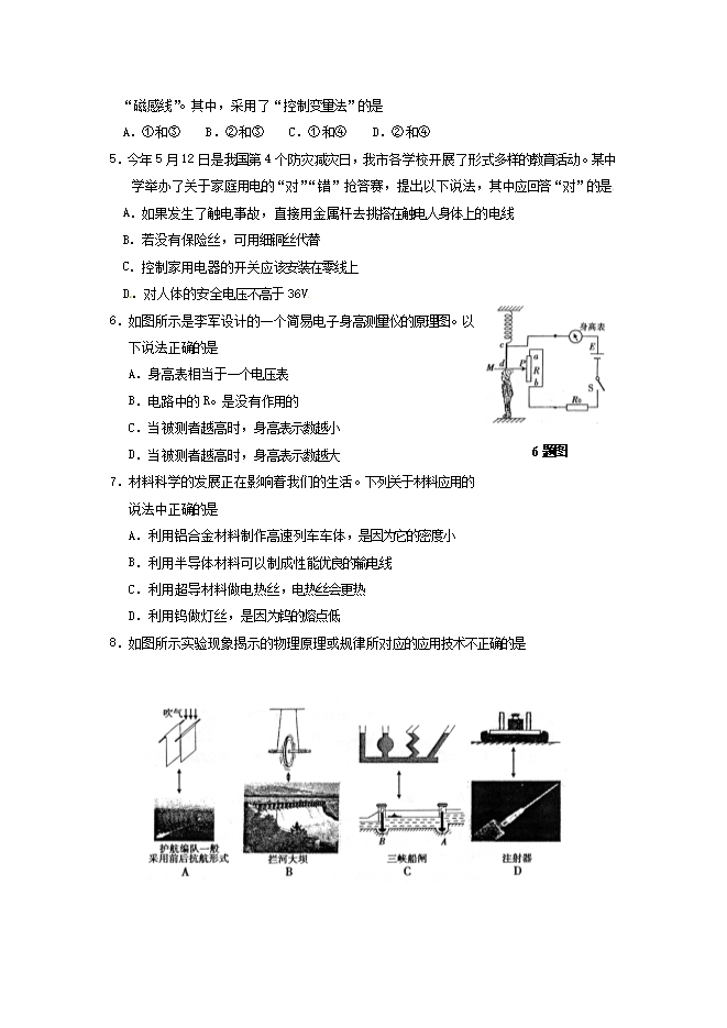4.下列是初中物理的几个探究实例:①探究“液体内部的压强与哪些因素有关”;②探究 “平面镜成像的特点”;③探究“电阻上的电流跟两端电压的关系”;④探究磁场时,引入 “磁感线”。其中,采用了“控制变量法”的是