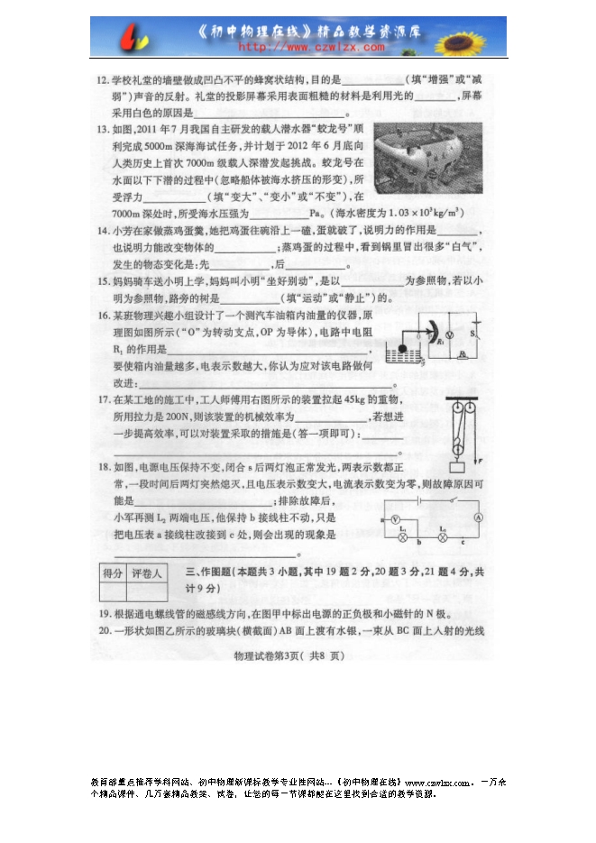 【内容简介】辽宁省朝阳市2012年初中升学考试物理试卷及答案(扫描版)