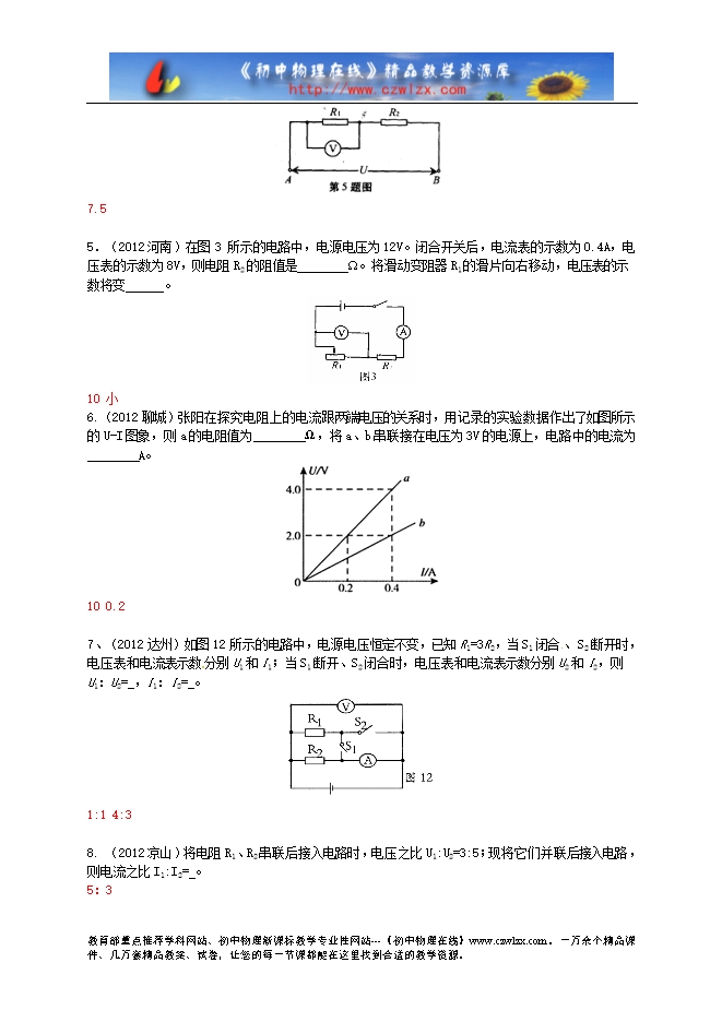 4、(2012安徽)图示的电路中,电阻R1和R2串联接在AB两端,电压表并联接在R1两端。已知R1=10Ω,R2=20Ω,电压表示数为2.5V,则AB两端的电压U= V。