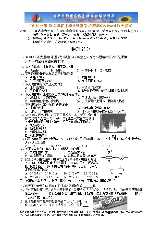 广西梧州市2012年初中毕业升学考试物理试题(word版无答案)