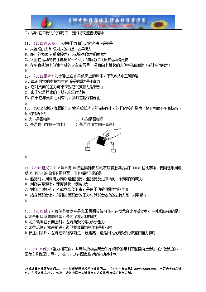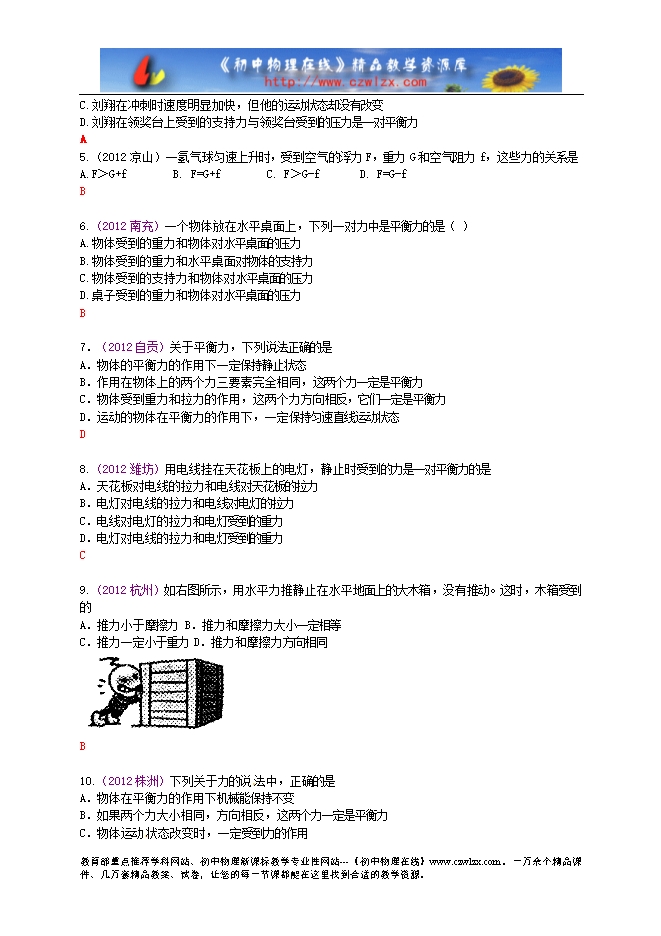 2.(2012安顺)下图中的A、B、C、D分别是用照相机拍摄(每0.1s拍摄一次)的小球在四种不同运动状态下的照片,其中小球受到平衡力作用是:
