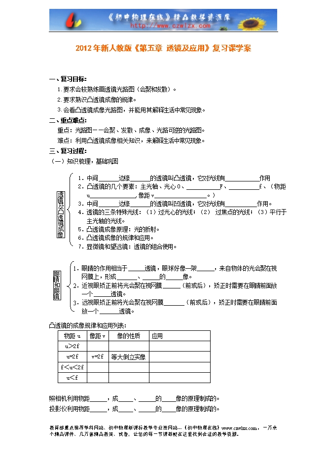 2012年新人教版《第五章 透镜及应用》复习课学案