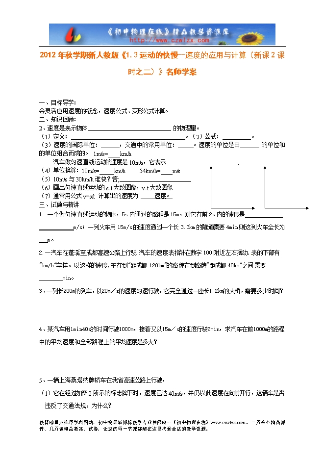2012年秋学期新人教版《1.3运动的快慢--速度的应用与计算(新课2课时之二)》名师学案