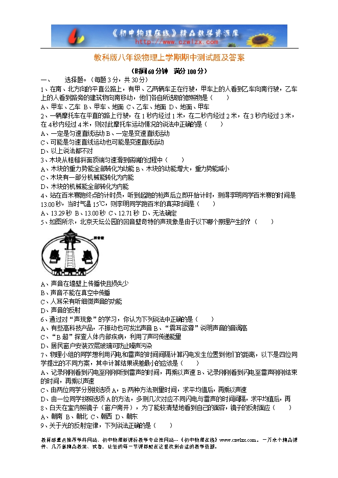 - 下一份试卷:教科版八年级物理上学期期中测试题及答案