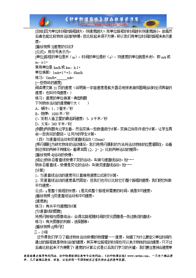 情感态度与价值观目标:有能用“运动快慢”的观点观察和分析身边事例的意识。