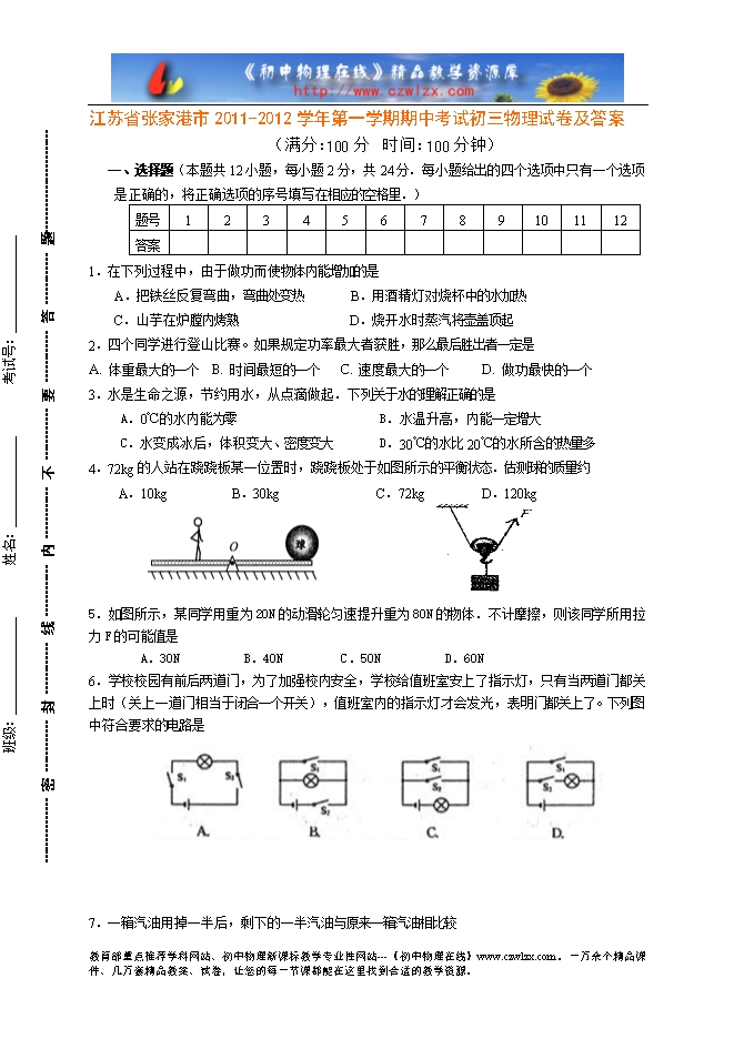 江苏省张家港市2011-2012学年第一学期期中考试初三物理试卷及答案