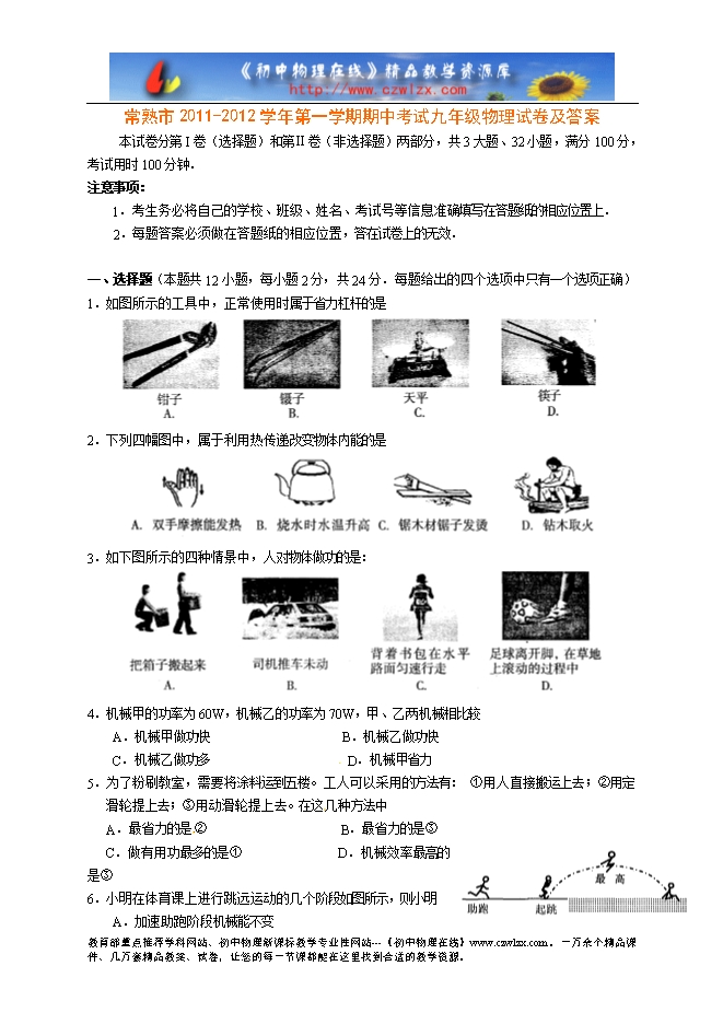 【内容简介】本试卷分第I卷(选择题)和第Ⅱ卷(非选择题)两部分,共3大题、32小题,满分100分,考试用时100分钟.注意事项: 1.考生务必将自己的学校、班级、姓名、考试号等信息准确填写在答题纸的相应位置上. 2.每题答案必须做在答题纸的相应位置,答在试卷上的无效. 一、选择题(本题共12小题,每小题2分,共24分.每题给出的四个选项中只有一个选项正确) 1.如图所示的工具中,正常使用时属于省力杠杆的是 2.下列四幅图中,属于利用热传递改变物体内能的是 3.如下图所示的四种情景中,人对物体做功的是: 4.机械甲的功率为60W,机械乙的功率为70W,甲、乙两机械相比较 A.机械甲做功快     B.机械乙做功快 C.机械乙做功多     D.机械甲省力 5.为了粉刷教室,需要将涂料运到五楼。工人可以采用的方法有: ①用人直接搬运上去;②用定滑轮提上去;③用动滑轮提上去。在这 几种方法中 A.最省力的是 ② B.最省力的是③ C.做有用功最多的是① D.机械效率最高的是③ ....... ? ? ?