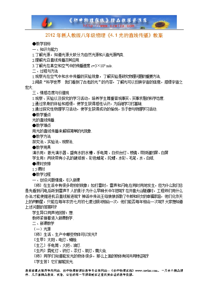 2012年新人教版八年级物理《4.1光的直线传播》教案