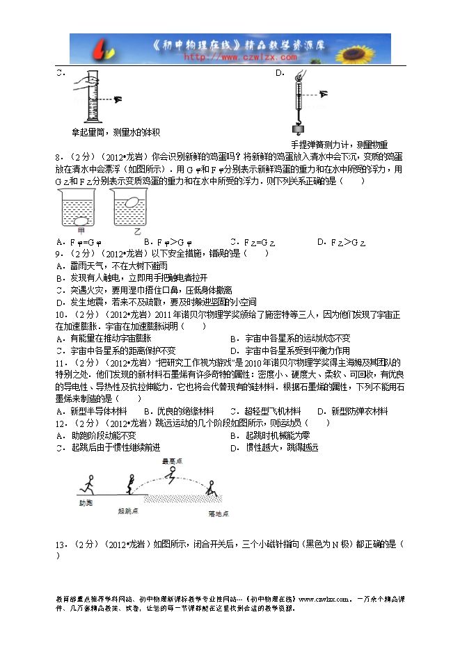 2012年福建省龙岩市中考物理试卷及解析(word版)