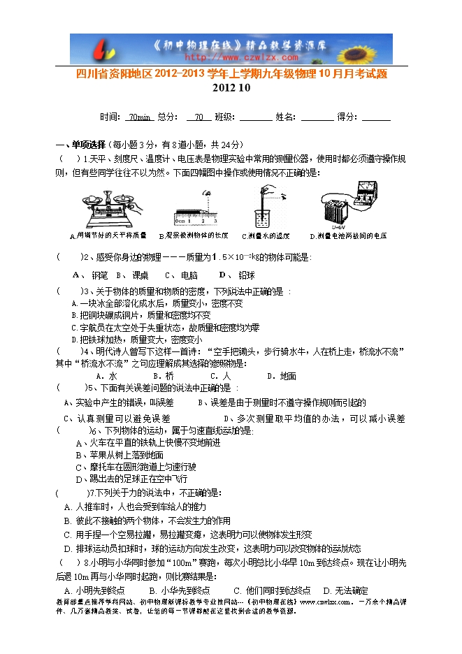 四川省资阳地区2012-2013学年上学期九年级物理10月月考试题