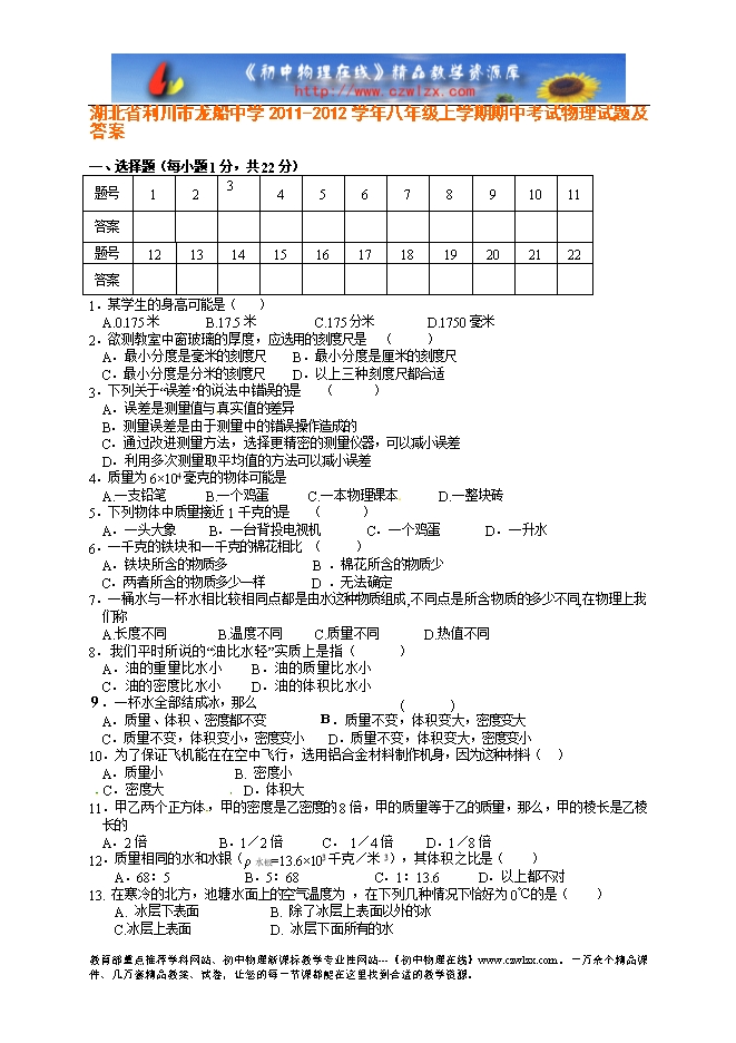 湖北省利川市龙船中学2011-2012学年八年级上学期期中考试物理试题及答案