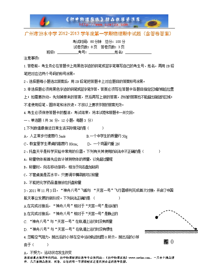 广州市汾水中学2012-2013学年度第一学期物理期中试题(含答卷答案)
