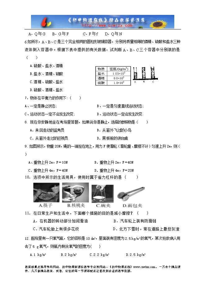 5. 某人拉一小车在水平地面上做匀速直线运动,设人对小车的拉力方向水平,大小为F;车重为G,车对地面的压力为Q,地面对车的支持力为N,车受到的阻力为f,下列各对力中属于平衡力的是( )