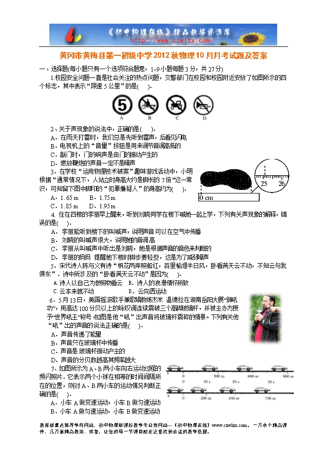 黄冈市黄梅县第一初级中学2012秋物理10月月考试题及答案