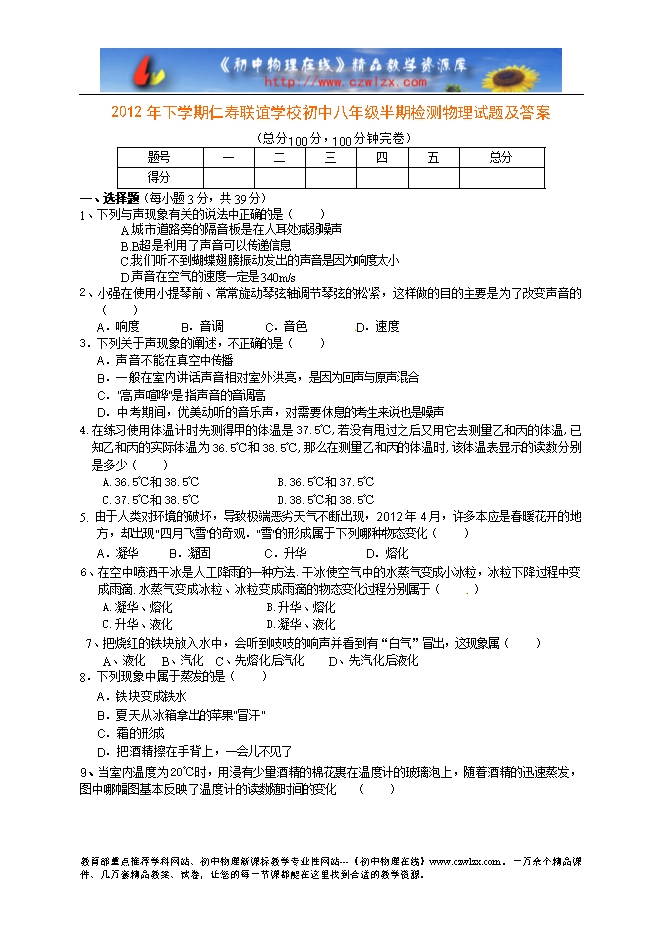 2012-2013学年上学期仁寿联谊学校初中八年级半期检测物理试题及答案