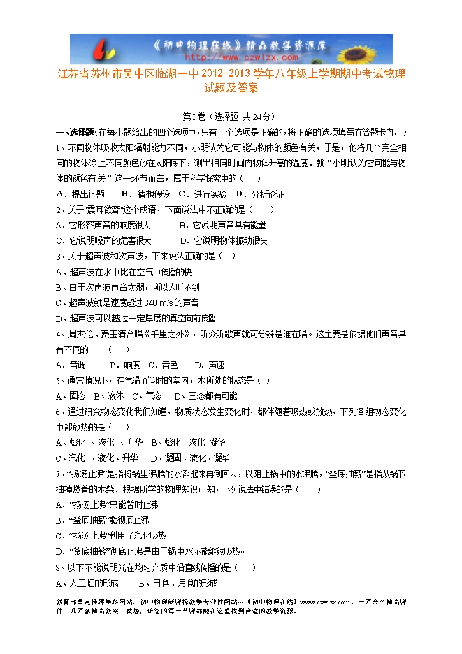 江苏省苏州市吴中区临湖一中2012-2013学年八年级上学期期中考试物理试题及答案