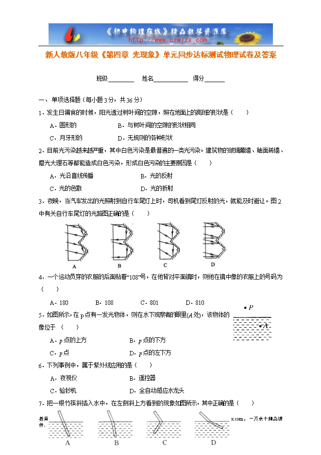 5.如图所示,在p点有一发光物体,则在水下观察者的眼里(A处),该物体的像位于 ( )