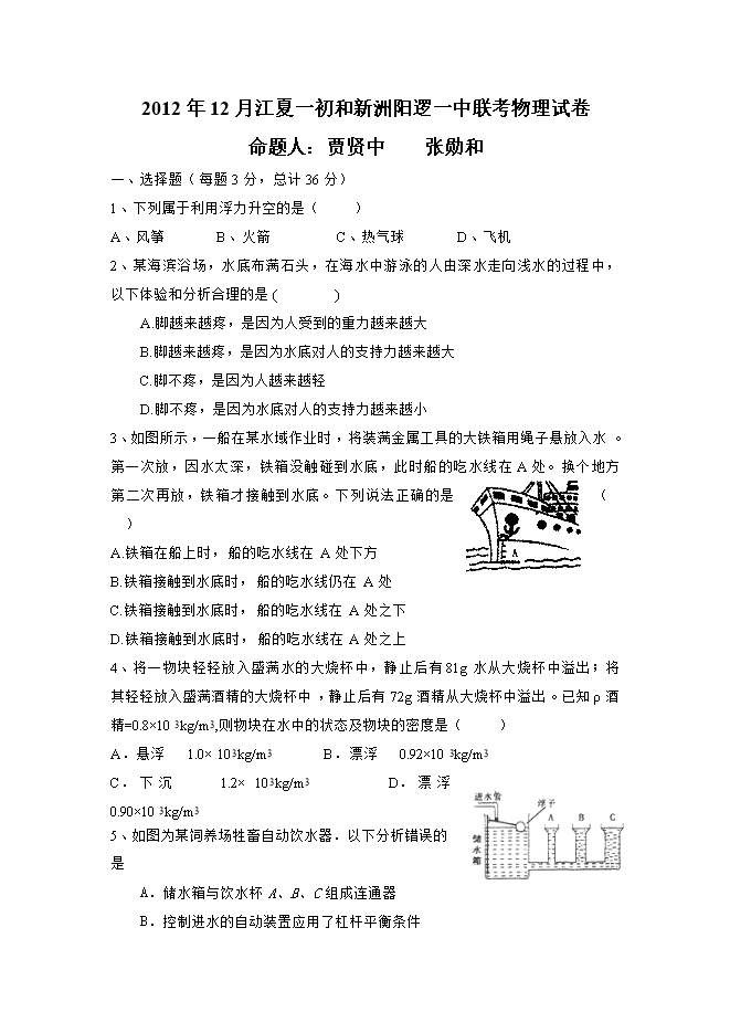 2012年12月江夏一初和新洲阳逻一中联考物理试卷(压强和浮力 功和机械能,无答案)