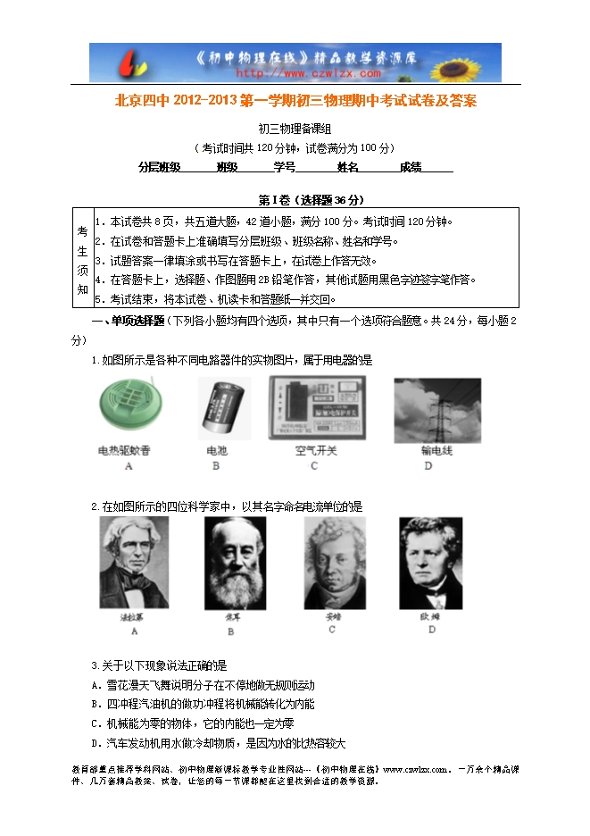 北京四中2012-2013第一学期初三物理期中考试试卷及答案